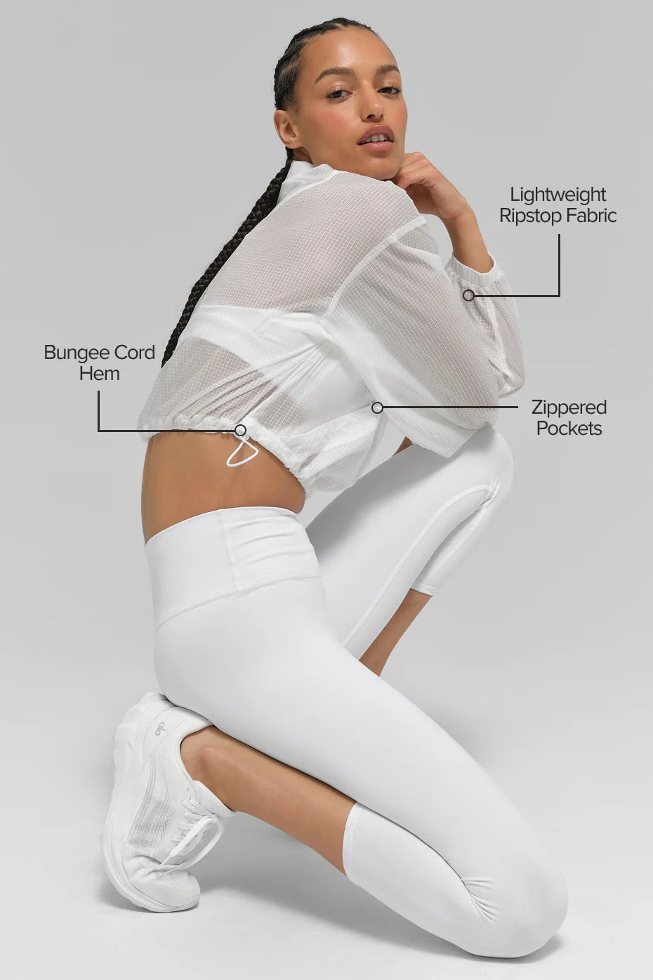 Bring a modern edge to functional outerwear with the Game Time Full-Zip Jacket. This style has a cropped silhouette, adjustable bungee hem, and subtle, architectural lines that add a little more detail to a clean look. It’s the perfect lightweight layer to toss on post-studio or wear as a statement piece.