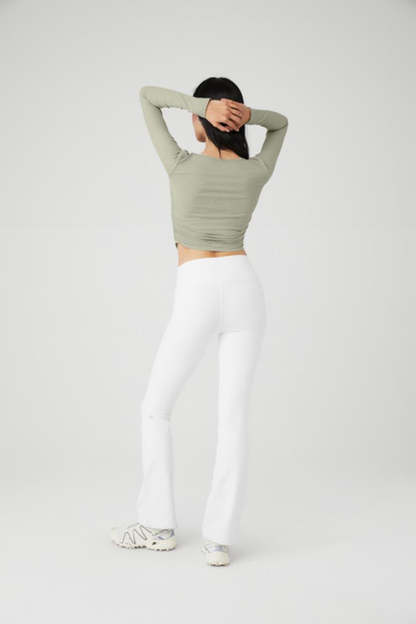 You’ll reach for this top for everything from casual outings to gentle cat-cows. It’s so soft it’s almost silky, slightly sheer and subtly ribbed for extra style points. Fitwise, it hugs the body with a flattering crewneck, a cropped hem and cute, ruched sides. Pick a hue and pair it with leggings and lounge pants galore.
