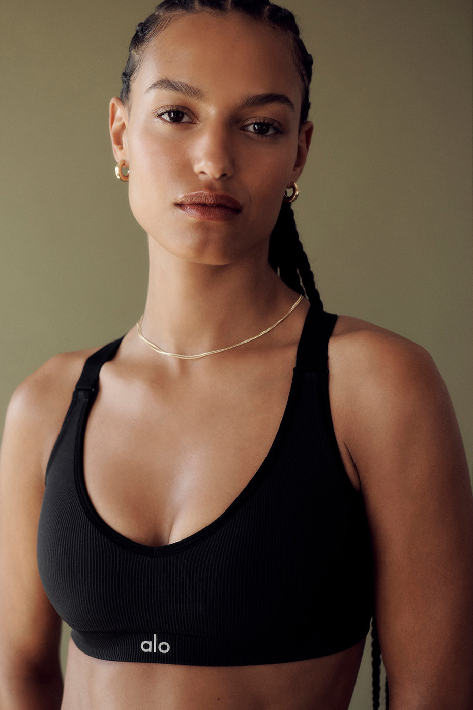 Cute and comfy with perfect fit and practical details, this bra is made from our signature Seamless Ribbed fabric for a snug, slightly compressive fit. The adjustable straps can be worn crisscrossed or straight, and the back features a stay-put hook-and-eye closure. More to love: The subtle V-neck and the fact that it goes with everything in your activewear rotation.