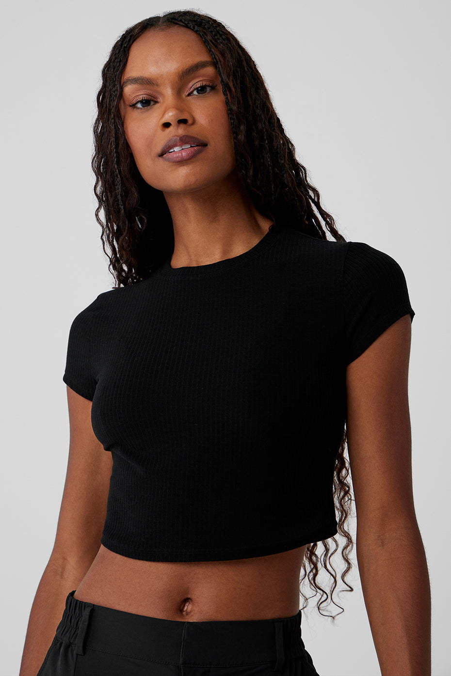 Cut from a soft, stretchy, ribbed fabric blend, this trusty tee is a closet staple you*ll want to buy in multiples. It has a classic crewneck, a slim fit, and not-too-short, not-too-long cap sleeves. Finished with a waist-length crop to pair perfectly with all your favorite high-waisted bottoms.