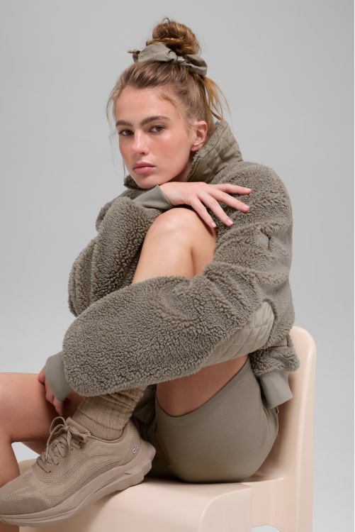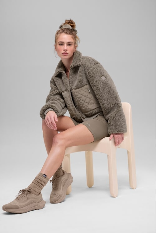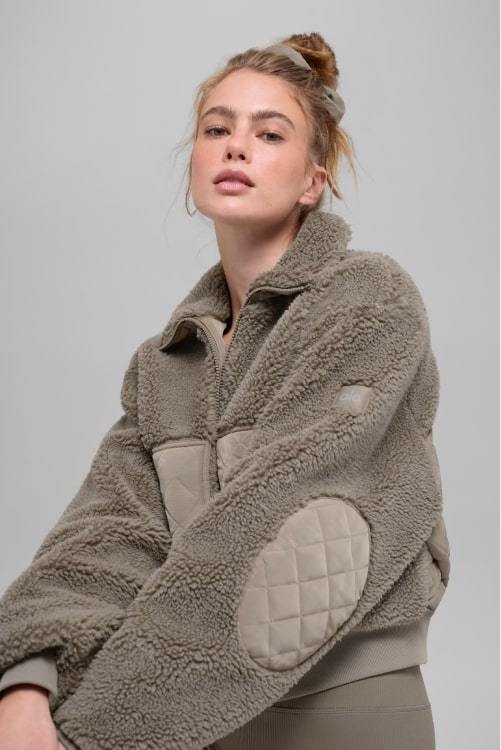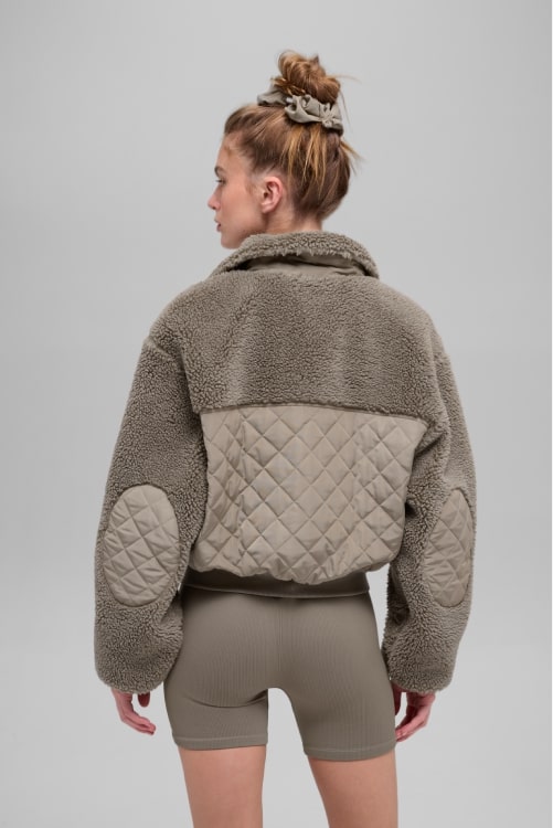 Done in sherpa with quilted patches at the pockets, elbows and back, this bomber jacket is, well, the bomb. We love the boxy, slightly cropped silhouette and the ribbing at the cuffs and hem— it makes the fit even cozier. Throw it on over a matching set en route to your workout, zip it all the way up, show off the sherpa-lined collar.