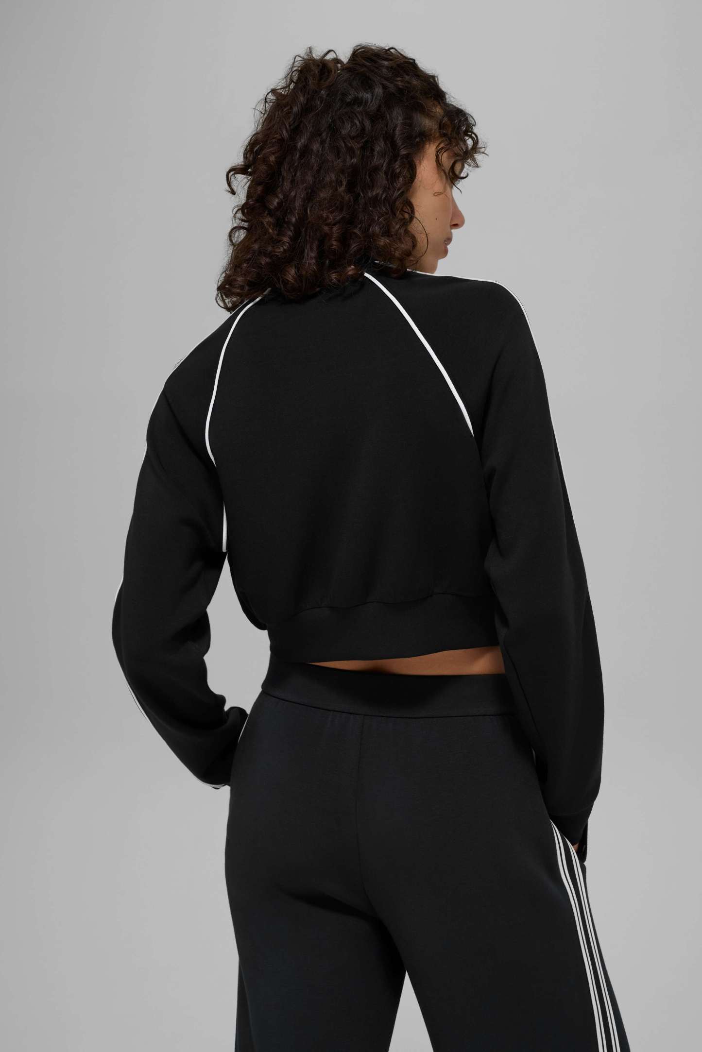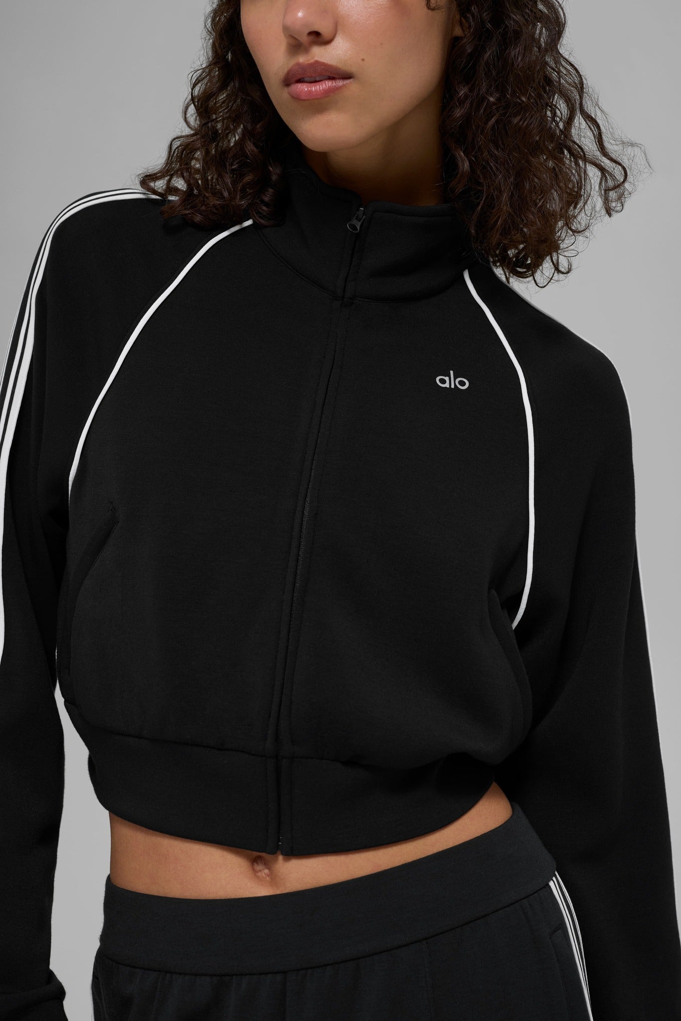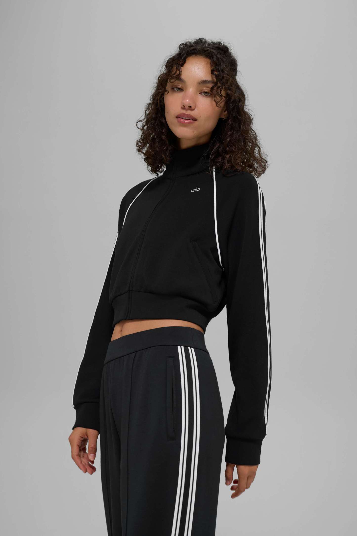 The Track Star Full-Zip Jacket is the piece that instantly sharpens your look. Cut in a cropped silhouette with a high collar and clean full-zip, it’s designed to elongate your frame and highlight your waist. Bold contrast stripes add a pop of energy, while the soft, stretchy fabric moves with you from warm up to wind down. Pair it with the matching Track Star Mini Skirt or layer it with your favorite matching set for a sleek, athletic look.