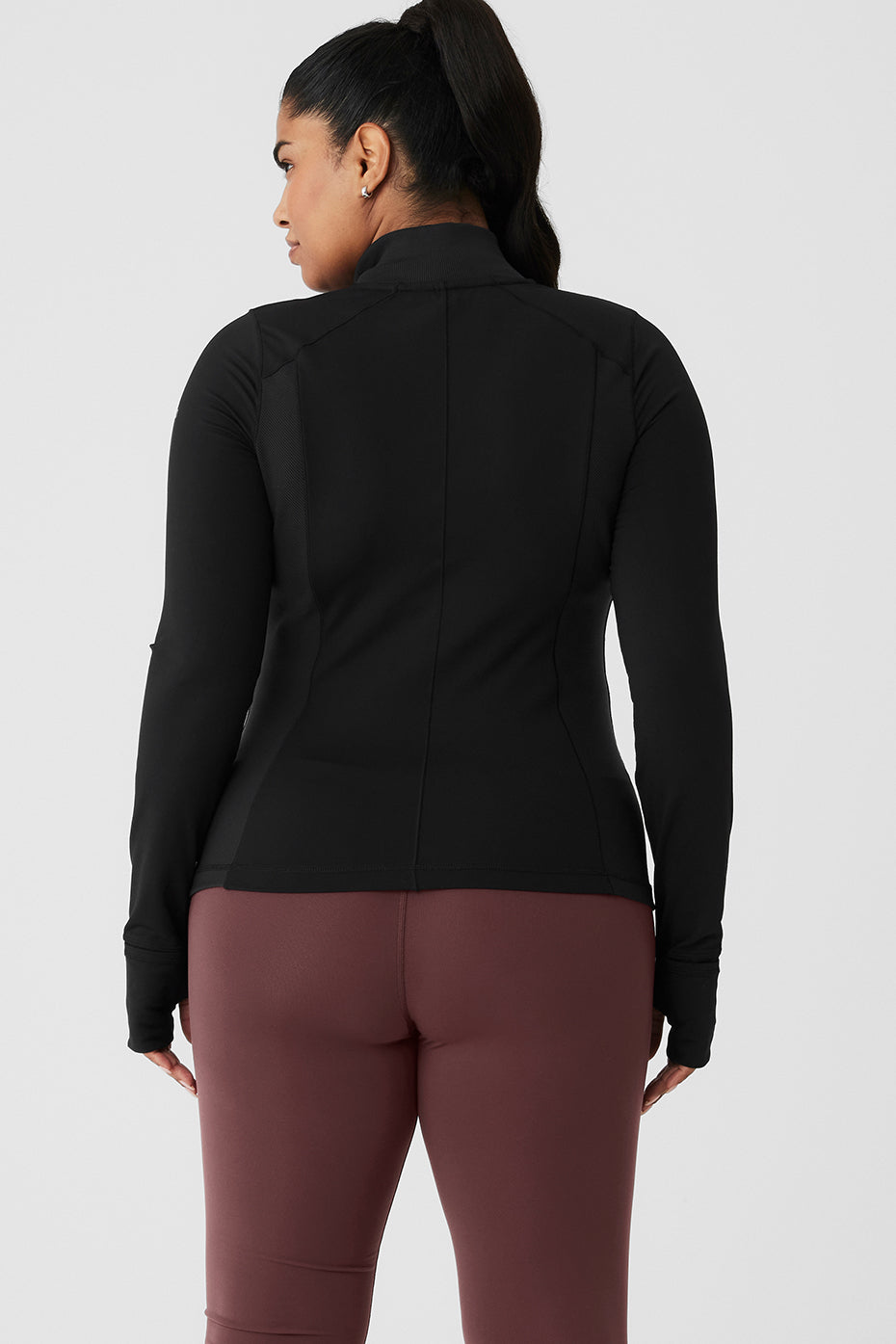 Make a break for the finish line wearing the Airbrush Formation Jacket. Breathable, cotton-y matte Airbrush fabric takes on perfect form in this full-zip, full length performance jacket. With a ribbed collar, fold-over arm cuffs, thumbholes and a sweet underbust seam detail, it*s the perfect companion for outdoor activities, light flows, barre and transitioning your post-practice look.
